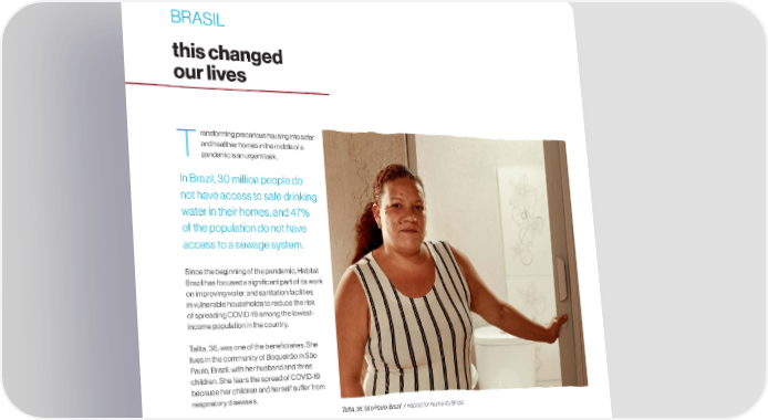 BRASIL this changed our lives ransforming precarious housing into safer and healthier homes in the middle of a Tpandemic is an urgent task. In Brazil, 30 million people do not have access to safe drinking water in their homes, and 47% of the population do not have access to a sewage system. Since the beginning of the pandemic, Habitat Brazil has focused a signi昀椀cant part of its work on improving water and sanitation facilities in vulnerable households to reduce the risk of spreading COVID-19 among the lowest- income population in the country. Talita, 36, was one of the bene昀椀ciaries. She lives in the community of Boqueirão in São Paulo, Brazil, with her husband and three children. She fears the spread of COVID-19 because her children and herself su昀昀er from respiratory diseases. Talita, 36, São Paulo, Brazil. / Habitat for Humanity Brasil. PAGE. 18 habitat.org/lac