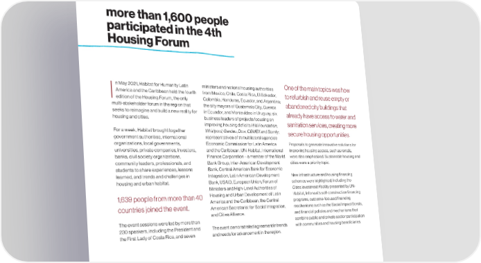 more than 1,600 people participated in the 4th Housing Forum n May 2021, Habitat for Humanity Latin ministers and national housing authorities One of the main topics was how America and the Caribbean held the fourth from Mexico, Chile, Costa Rica, El Salvador, to refurbish and reuse empty or I edition of the Housing Forum, the only Colombia, Honduras, Ecuador, and Argentina; abandoned city buildings that multi-stakeholder forum in the region that the city mayors of Guatemala City, Cuenca seeks to reimagine and build a new reality for in Ecuador, and Montevideo in Uruguay; six already have access to water and housing and cities. business leaders of projects focusing on sanitation services, creating more improving housing deficits Hilti Foundation, For a week, Habitat brought together Whirlpool, Gerdau, Dow, CEMEX and Somfy; secure housing opportunities. government authorities, international representatives of 11 multilateral agencies organizations, local governments, Economic Commission for Latin America Proposals to generate innovative solutions for universities, private companies, investors, and the Caribbean, UN-Habitat, International improving housing access, such as rentals, banks, civil society organizations, Finance Corporation – a member of the World were also emphasized. Sustainable housing and community leaders, professionals, and Bank Group, Inter-American Development cities were a priority topic. students to share experiences, lessons Bank, Central American Bank for Economic learned, and trends and challenges in Integration, Latin American Development New infrastructure and housing financing housing and urban habitat. Bank, USAID, European Union, Forum of schemes were highlighted, including the Ministers and High-Level Authorities of Cities Investment Facility presented by UN- 1,639 people from more than 40 Housing and Urban Development of Latin Habitat, Infonavit’s self-construction financing America and the Caribbean, the Central programs, outcome-focused financing countries joined the event. American Secretariat for Social Integration, mechanisms such as the Social Impact Bonds, and Cities Alliance. and financial policies and mechanisms that The event sessions were led by more than combine public and private sector participation 230 speakers, including the President and The event demonstrated agreement in trends with communities and housing beneficiaries. the First Lady of Costa Rica, and seven and needs for advancement in the region. PAGE. 40 habitat.org/lac