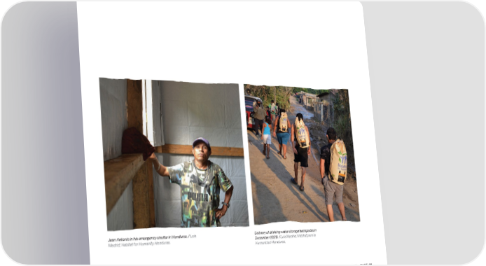 Juan Antonio in his emergency shelter in Honduras. / Luis Delivery of drinking water storage backpacks in Madrid, Habitat for Humanity Honduras. December 2020. / Luis Madrid, Hábitat para la Humanidad Honduras. Annual Report - Latin America and the Caribbean, 2021 PAGE. 27