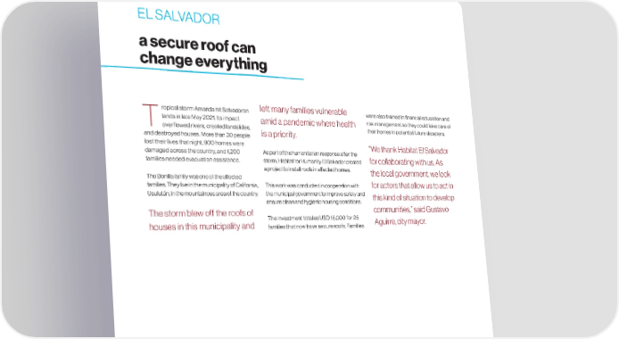EL SALVADOR a secure roof can change everything ropical storm Amanda hit Salvadoran left many families vulnerable were also trained in 昀椀nancial education and lands in late May 2021. Its impact amid a pandemic where health risk management so they could take care of Tover昀氀owed rivers, created landslides, is a priority. their homes in potential future disasters. and destroyed houses. More than 30 people lost their lives that night, 900 homes were “We thank Habitat El Salvador damaged across the country, and 1,200 As part of the humanitarian response after the families needed evacuation assistance. storm, Habitat for Humanity El Salvador created for collaborating with us. As a project to install roofs in a昀昀ected homes. the local government, we look The Bonilla family was one of the a昀昀ected families. They live in the municipality of California, This work was conducted in cooperation with for actors that allow us to act in Usulután, in the mountainous area of the country. the municipal government to improve safety and this kind of situation to develop ensure clean and hygienic housing conditions. The storm blew off the roofs of communities,” said Gustavo The investment totaled USD 15,000 for 25 Aguirre, city mayor. houses in this municipality and families that now have secure roofs. Families PAGE. 20 habitat.org/lac