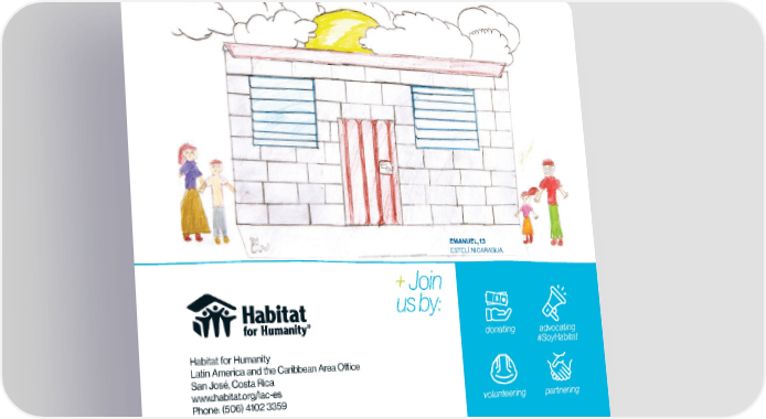 EMANUEL, 13 ESTELÍ, NICARAGUA. + Join us by: donating advocating #SoyHabitat Habitat for Humanity Latin America and the Caribbean Area O昀케ce San José, Costa Rica www.habitat.org/lac-es Phone: (506) 4102 3359 volunteering partnering lac@habitat.org