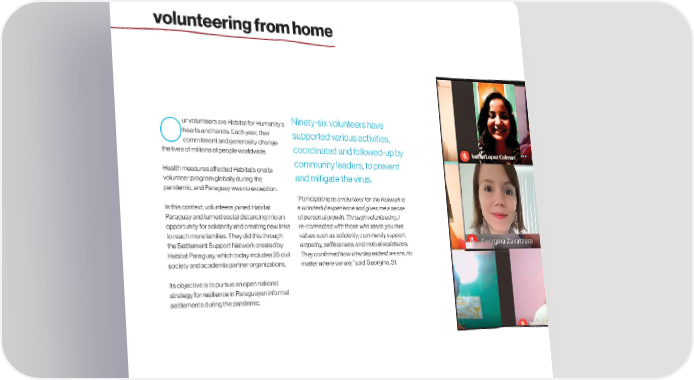 volunteering from home ur volunteers are Habitat for Humanity’s Ninety-six volunteers have hearts and hands. Each year, their supported various activities, commitment and generosity change O the lives of millions of people worldwide. coordinated and followed-up by community leaders, to prevent Health measures a昀昀ected Habitat’s onsite and mitigate the virus. volunteer program globally during the pandemic, and Paraguay was no exception. “Participating as a volunteer for the Network is In this context, volunteers joined Habitat a wonderful experience and gives me a sense Paraguay and turned social distancing into an of personal growth. Through volunteering, I opportunity for solidarity and creating new links re-connected with those who teach you rare to reach more families. They did this through values such as solidarity, community support, the Settlement Support Network created by empathy, sel昀氀essness, and mutual assistance. Habitat Paraguay, which today includes 25 civil They con昀椀rmed how interdependent we are, no society and academia partner organizations. matter where we are,” said Georgina, 31. Its objective is to pursue an open national strategy for resilience in Paraguayan informal settlements during the pandemic. PAGE. 38 habitat.org/lac