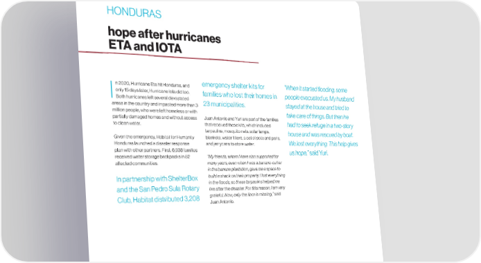 HONDURAS hope after hurricanes ETA and IOTA n 2020, Hurricane Eta hit Honduras, and emergency shelter kits for “When it started 昀氀looding, some only 15 days later, Hurricane Iota did too. families who lost their homes in people evacuated us. My husband I Both hurricanes left several devastated 23 municipalities. stayed at the house and tried to areas in the country and impacted more than 3 million people, who were left homeless or with take care of things. But then he partially damaged homes and without access Juan Antonio and Yuri are part of the families had to seek refuge in a two-story to clean water. that received these kits, which included tarpaulins, mosquito nets, solar lamps, house and was rescued by boat. Given the emergency, Habitat for Humanity blankets, water 昀椀lters, a set of pots and pans, Honduras launched a disaster response and jerrycans to store water. We lost everything. This help gives plan with other partners. First, 6,938 families us hope,” said Yuri. received water storage backpacks in 52 “My friends, whom I have also supported for a昀昀ected communities. many years, even when I was a banana-cutter in the banana plantation, gave me a space to In partnership with ShelterBox build a shack on their property. I lost everything in the 昀氀oods, so these tarpaulins helped me and the San Pedro Sula Rotary live after the disaster. For this reason, I am very Club, Habitat distributed 3,208 grateful. Now, only the 昀氀oor is missing,” said Juan Antonio. PAGE. 26 habitat.org/lac