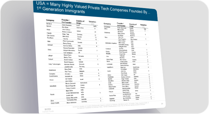 USA = Many Highly Valued Private Tech Companies Founded By… 1st Generation Immigrants Company Founder / Country of Valuation Company Founder / Country of Valuation Co-Founder Origin ($B) Co-Founder Origin ($B) WeWork Adam Neumann Israel $47B Crowdstrike Dmitri Alperovitch Russia $3B SpaceX Elon Musk South Africa 31 Affirm Max Levchin Ukraine 3 John Collison Ali Ghodsi Sweden Stripe Ireland 23 Databricks Matei Zaharia Romania 3 Patrick Collison Ion Stoica Romania Palantir Peter Thiel Germany 21 Jiajun Zhu China Epic Games Mark Rein Canada 15 Nuro Dave Ferguson New Zealand 3 DoorDash Tony Xu China 13 Ankur Kothari India Wish Peter Szulczewski Canada 9 Automation Anywhere Mihir Shukla India 3 Danny Zhang Neeti Metha Shukia India Instacart Apoorva Mehta India 8 Rushabh Parm India Stewart Butterfield Canada Confluent Jun Rao China 3 Slack Russia 7 Neha Narkhede India Serguei Mourachov Roblox David Baszucki Canada 2 Cal Henderson UK Medallia Borge Hald Norway 2 UiPath* Daniel Dines Romania 7 Lime Toby Sun China 2 Marius Tirca Brad Bao Tanium David Hindawi Iraq 7 Zume Pizza Alex Garden Canada 2 David Helgason Iceland Gusto TomerLondon Israel 2 Unity Technologies Nicholas Francis Denmark 6 Lemonade Shai Wininger Israel 2 Germany Daniel Schreiber Joachim Ante LegalZoom Brian Lee South Korea 2 Robinhood Baiju Bhatt India 6 Al Goldstein Uzbekistan Vlad Tenev Bulgaria Avant John Sun China 2 Compass Ori Allon Israel 4 Paul Zhang China Credit Karma Kenneth Lin China 4 Apttus Krik Krappe UK 2 Adi Tatarko Postmates Bastian Lehmann Germany 2 Houzz Israel 4 Sprinklr Ragy Thomas India 2 Alon Cohen Cloudflare Michelle Zatlyn Canada 2 Marcin Zukowski Netherlands Carta Manu Kumar India 2 Snowflake Benoit Dageville France 4 ZocDoc Oliver Kharraz Germany 2 Thierry Cruanes France Warby Parker Dave Gilboa Sweden 2 Bipul Sinha India Carbon3D Alex Ermoshkin Russia 2 Arvind Nithrakashyap India Pony.ai James Peng China 2 Rubrik India 3 Tiancheng Lo Arvind Jain Ara Mahdessian Iran Soham Mazumdar India ServiceTitan VaheKuzoyan Armenia 2 Zoox Tim Kentley-Klay Australia 3 Segment Ilya Volodarsky Russia 2 Oscar Health Mario Schlosser Germany 3 Quanergy Tianyue Yu China 2 Source for Valuation & Founders Backgrounds: Based on analysis by Pitchbook, Wall Street Journal, CB Insights, Forbes, Business Insider, & the National Foundation for American Policy. *UiPath is headquartered in New York, NY but was originally founded in Romania. Internet Trends 261 2019