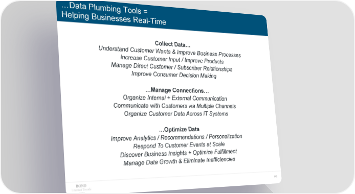 …Data Plumbing Tools = Helping Businesses Real-Time Collect Data… Understand Customer Wants & Improve Business Processes Increase Customer Input / Improve Products Manage Direct Customer / Subscriber Relationships Improve Consumer Decision Making …Manage Connections… Organize Internal + External Communication Communicate with Customers via Multiple Channels Organize Customer Data Across IT Systems …Optimize Data Improve Analytics / Recommendations / Personalization Respond To Customer Events at Scale Discover Business Insights + Optimize Fulfillment Manage Data Growth & Eliminate Inefficiencies Internet Trends 145 2019