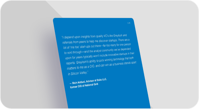 \\ 09 “I depend upon insights from quality VC’s like Greylock and referrals from peers to help me discover startups. There are a lot of ‘me too’ start-ups out there—far too many for one person to sort through—and the analyst community we’ve depended upon for years typically won’t include innovative startups in their reports. Greylock’s ability to pick winning technology that both matters to me as a CIO, and can win as a business stands apart in Silicon Valley.” — Rich Adduci, Advisor at Esito LLC, former CIO of National Grid Startups Serving The Enterprise