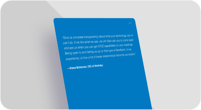 \\ 17 “Give us complete transparency about what your technology can or can’t do. If we like what we see, we will often ask you to come back and see us when you can get X/Y/Z capabilities on your roadmap. Being open to and taking us up on that type of feedback, in my experience, is how a lot of these relationships become successful.” —Diana McKenzie, CIO of Workday Startups Serving The Enterprise