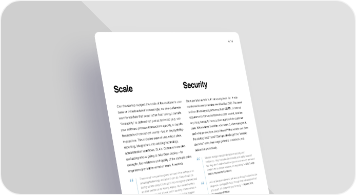 \\ 14 Scale Security Can the startup support the scale of the customer’s user Startups told us this is #1 on everyone’s list. It was base or infrastructure? Increasingly, we see customers mentioned in every interview we did with a CXO. The need want to validate that scale rather than taking it on faith. is often driven by regulation such as GDPR, or internal “Scalability” is defined not just as technical (e.g. can requirements for sophisticated access control, and the your software process transactions quickly, or handle key thing here is to have a clear approach to customer thousands of concurrent users) — but in deployability- data. Where does it reside, who owns it, who manages it, in-practice. This includes ease of use, rollout plan, and what protections does it have? What vendor risk does reporting, integrations into existing technology, the startup itself have? Startups should get the “security administration workflows, SLA’s. Customers are also checklist” early from large potential customers, and evaluating who is going to help them deploy — for address it proactively. example, the existence and quality of the startup’s sales engineering or implementation team, if needed. We see startups repeatedly miss on security and “ resiliency — they have the functionality and agility we want These small companies spend so much time selling us on but they don’t understand the rigor around security we need. “ amazing technology and what it can do. They should be And it’s not a choice we have, it’s regulatory.”—CIO, Large telling us how easy it is to get it into our legacy environment Public Payments Company and not belittle us for having legacy. Our newest system A lot of [large customers] will also go through extensive due is twelve years old. It’s not just in banking: that mismatch “ diligence — being able to go through that with ease will set between startups and larger companies is the biggest you apart. It’ll show that you’re ready.”—Robert Kim, barrier.” —Thomas Nielsen, Chief Digital Officer of Co-founder of Ritual Deutsche Bank Startups Serving The Enterprise