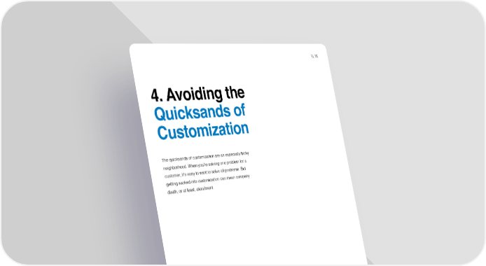 \\ 16 4. Avoiding the Quicksands of Customization The quicksands of customization are an especially tricky neighborhood. When you’re solving one problem for a customer, it’s easy to want to solve all problems. But getting sucked into customization can mean company death, or at least, derailment. Startups Serving The Enterprise