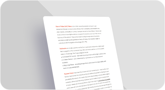 monetization to be reimagined. The impact of digitisation on newspaper, television Store of Value (SoV) Tokens rely on their censorship resistant and peer to peer and movie content is well documented: new titans like Netflix and Spotify have arisen transaction features to ensure a store of value that is completely uncorrelated to any and firms like Blockbuster and Kodak are marginalised or gone. We have now become other market, commodity or currency. Examples include the likes of Bitcoin, Monero and convinced that tokenisation will be to ownership as digitisation was to content. Zcash which all have slight variations on speed of transactions, security of the network & privacy of the network. These come closest to being the equivalent of currencies “Tokenisation is to and when considering the quantitative theory of money, their dynamics might be understood with the equation of exchange (MV = PQ). OWNERSHIP Stablecoins aim to decouple the volatility from cryptoassets and provide a digital asset as digitisation was tothat is pegged to a fiat counterpart (e.g. USD) and mainly used as a unit of account & medium of exchange. The 3 large categories include: content.” • Centralised IOU Issuance - kept stable by an equal reserve of fiat that is centrally held. • Collateral Backed - over-collateralised by cryptoassets such as Ether escrowed trustlessly. Types of tokens • Seignorage Shares - recreating an algorithmic central bank that keeps stability with levers on supply and demand. Diving into the universe of tokens, we classify the different characteristics into three core categories: Currencies & Commodities, Utility Tokens and Security Tokens. Bearing Payment Tokens have been the simplest and most iterated version - they’ve often been in mind that any individual token might exhibit several of the characteristics at the forcibly implemented into networks as the sole method of payment for the digital asset same time or even evolve their characteristics over their life cycle of the underlying provided by the network. As a result, they come close to being currencies within a digital network, we have summarised our view of these characteristics below:economy, without ever becoming investable, liquid or stable enough to become stores of value. Instead, at a future equilibrium, they’ll look closer to a form of working capital, which users will try to minimise due to the opportunity cost of capital. As a result, they A Taxonomy of Token are likely to end up with an extremely high velocity, but a low value accrual. Through the Characteristics nature of open source code (copyable & forkable), these token models run at a high risk of being forked and replaced by equivalent protocols that enable payments in a proper SoV token. Security Tokens are a tokenised representation of assets ranging from traditional commodities & equities, to pieces of art and all the way to pieces of virtual land in the form of crypto collectibles. The former rely on a strong guarantee of ownership of the underlying asset and can be valued by the worth of their underlying asset with a premium for liquidity, divisibility and accessibility. The latter often represents scarce digital assets that are valued like art or real estate - i.e. fame of creator, location in a digital landscape & overall demand for asset. Governance Tokens give the holders a vote in how a network is run, where developers focus their efforts & when software upgrades should be implemented. As the value of Graphic 4: Taxonomy of token characteristics, Fabric Venturesa network goes up - via the number of companies running on top of it or the number 38 39