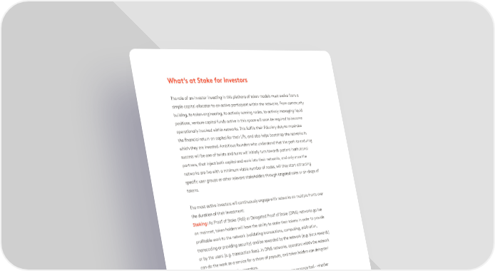 of transactions it handles - the ability to influence its development will become a What’s at Stake for Investors scarce resource. The price of the voting power in such a network is in fact likely to scale exponentially with the value it secures. This token feature is generally combined with one the aforementioned token designs.The role of an investor investing in this plethora of token models must evolve from a simple capital allocator to an active participant within the networks. From community Discount Tokens give owners the right to discounts on purchases of an asset provided building, to token engineering, to actively running nodes, to actively managing liquid by a digital network. Buying into a discount token can be equated to buying into a positions, venture capital funds active in this space will soon be required to become coop, and getting the right to a set discount percentage of all economic activity within operationally involved within networks. This fulfills their fiduciary duty to maximise the network. As the value and activity of the network grows, the holder of the token the financial return on capital for their LPs, and also helps bootstrap the networks in can claim a larger value of discount - effectively modelling a royalty fee that can only which they are invested. Ambitious founders who understand that the path to enduring be claimed in terms of network services (no monetary payouts). success will be one of twists and turns will initially turn towards patient institutional partners, that inject both capital and work into their networks, and only once the Work Tokens operate on the idea that service providers need to have ‘skin in the game’ networks are live with a minimum viable number of nodes, will they start attracting to be incentivised to provide high quality work for the network. Whether it’s objective specific user groups or other relevant stakeholders through targeted sales or air-drops of work such as computational resources or subjective work such as qualitative ratings, tokens. service providers are obliged to stake a certain amount of tokens into the network in exchange of the right to provide profitable work. If the work is done ‘correctly’ the The most active investors will continuously engage with networks on multiple fronts over service provider is awarded the fees paid by the user (not necessarily in the native the duration of their investment: token). In contrast, if the service provider acts maliciously, their stake is slashed & Staking: As Proof of Stake (PoS) or Delegated Proof of Stake (DPoS) networks go live distributed to other service providers. As the network grows in usage, there will be an on mainnet, token holders will have the ability to stake their tokens in order to provide increased amount of immediate and future profitable work to be delivered, leading to profitable work to the network (validating transactions, computing, arbitration, a rise in service providers desiring to deliver this work. As a result, the demand for these transcoding or providing security) and be rewarded by the network (e.g. block rewards) work tokens will increase and due to their fixed supply, the price of the tokens should or by the users (e.g. transaction fees). In DPoS networks, operators within the network rise with usage of the network. We’ve further explored the value derived by work tokens can do the work as a service for a share of payouts, and token holders can delegate/ in a dedicated post. bond their tokens to the operators. Voting: Numerous networks are using their tokens as a governance tool - whether Burn & Mint Equilibrium Tokens are architected on two simple characteristics: users of through simple token voting, quadratic voting or liquid democracy, the tokens give a the network pay for services with the tokens, but instead of paying fees, they burn their voice to their holders. Long term investors will participate in the governance process of tokens (denominated in USD) & at the same time there is a constant inflation process the network, and steer it in the direction of their best interest. of new tokens being minted (denominated in native token). As the service providers are Curating: With Token Curated Registries (TCR), early investors in such networks will referenced by the users of the network for each burned token, they receive an allocation need to actively participate in the curation process, simultaneously keeping the registry of the newly minted tokens as payment. As a result, when the platform usage increases at high quality, as well as signalling the quality of curators involved. and users burn more tokens than are issued through inflation, the supply will decrease Running Nodes & Simple Usage of Network: As investors might also be users of and push up the price per token. networks, they might actively build early iterations of use-cases for the networks. From running nodes within the network for their own data-driven tracking purposes to actively participating within the network’s economy (e.g. buying services/assets), these investors will initially seed the ecosystems built on top of the networks. Beyond simply committing to actively participate in portfolio networks, Fabric has already begun setting up the infrastructure within certain testnets. Some of our early experiments of running nodes within the Ocean Protocol testnet are documented in a dedicated blog post. 40 41