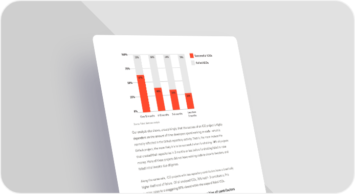 100% Successful ICOs 33% 60% 64% 74% Github commit activity Failed ICOs 75% BEFORE and AFTER 67% 50% fundraising start : 40% 36% 25% 26% Weekly ICO repository activity pre- and post- fundraising shows a clear increase in 0% the number of active repositories during the weeks leading up to the fundraising Over 12 months 6-12 months 3-6 months Less than date. For successful ICOs, code commits spiked typically between 2 - 4 weeks prior 3 months Source: Fabric Ventures analysis to the token sale date, suggesting many of these projects had a last minute push for Our analysis also shows, unsurprisingly, that the success of an ICO project is highly code finalisations prior to fundraising. For failed ICOs, in turn, the noticeable drop in dependent on the amount of time developers spend working on code - which is code commits over the fundraising period likely suggests a lack of funding and, as normally reflected in the Github repository activity. That is, the more mature the such, interest in the project. Failed projects with continued activity can be attributed Github project, the more likely it is to be successful when fundraising. 74% of projects to developers choosing to carry out the project despite insufficient funding. that created their repositories in 3 months or less before fundraising failed to raise money. Many of these projects did not have working code to show to investors, and failed initial investor due diligence. Code commits pre- and post- fundraising Along the same vein, ICO projects with less repository contributors have a drastically higher likelihood of failure. Of all analysed ICOs, 76% had 1- 3 contributors. This number raises to a staggering 89% viewed within the scope of failed ICOs. 60% Successful ICOs tend to have large communities of contributors s O C I l 40% a t o 60% t Failed ICO f o e g a Completed ICO t n 20% e s c O r C e I 40% P l a t o t f 0% o e g -5 0 5 10 a t n 20% e Number of weeks to fundraising start c r e P 0% Completed ICOs % Failed ICOs % 1 1-3 3-5 5-10 10-20 more than 20 Number of contributors Source: Fabric Ventures Github analysis of 140 ICOs (109 had <= 3 contributors, 31 had > 3 contributors) Source: Fabric Ventures analysis 26 27
