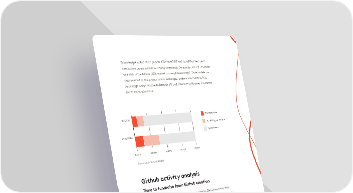 Airdrops as Extras Another token distribution mechanism that has gained popularity in token projects is TokenAnalyst looked at 20 popular ICOs from 2017 and found that their token Airdrop - a “free” distribution of tokens to a network of select wallets. The economic distributions across wallets were fairly centralised. On average, the top 10 wallets rationale behind the airdrop is that it increases the user base and populates the hold 60% of the tokens (50% market cap weighted average). Those wallets are network prior to launch. The data for 2018 shows that a third of all completed sales mostly owned by the project teams, exchanges, and pre-sale investors. This announced airdrops in addition to their token sale.percentage is high relative to Bitcoin’s 6% and Ethereum’s 11% ownership across top 10 wallet addresses. A handful of projects even used airdrops as a replacement for a public sale after they raised a large private round. The long term efficacy, as well as the regulatory position of airdrops is still uncertain - but they remain a strong marketing tool for generating communities around a project. BITCOIN TOP 10 Holders Width of Distribution 11- 100 Biggest Holders Token centralisation remained a primary topic of focus from a risk and valuation ETHEREUMRest of Users perspective. Most CentralisedBiggest Tail of Distribution 0,00 % 25.00% 50.00% 75.00% 100.00% GnosisIcon Source: Fabric Ventures analysis AirswapOmiseGo MKRNumeraire CivicREQ StatusQuantsamp Github activity analysis MANAEOS TronZRX Time to fundraise from Github creation AragonGolem REQVEChain Looking at time interval between a project creating its Github repository and ZRXAragon launching its (public) fundraising, we can see that more than half of analysed BancorDigix Dao projects (57%) created the code repository just 3 months or less before token QuantstampBancor sale. GolemCivic FunFairFunFair OmiseGoStatus 60% Total ICOs % NumeraireMANA 57% Digix DaoAirswap EOSTron 40% IconMKR VEChainGnosis 28% 20% 0,00 %20.00%40.00%60.00%80.00%100.00%0,00 %20.00%40.00%60.00%80.00%100.00% Percentage of tokens heldPercentage of tokens held9%7% 0% TOP 10 Holders11- 100 Biggest HoldersRest of UsersOver 12 months6-12 months3-6 monthsLess than 3 months Source: TokenAnalyst analysis of 20 popular token projects as of May 2018Source: Fabric Ventures analysis 24 25
