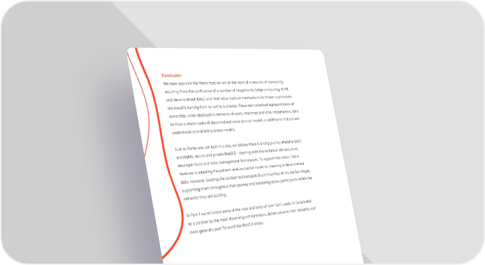 Conclusion Contributors We have explored the thesis that we are at the start of a new era of computing resulting from the confluence of a number of megatrends (edge computing, AI/ML and decentralised data) and that value capture mechanisms for these cryptoassets As ever, we are grateful to our friends for inspiration, helpful discussions, and are steadily turning from an art to a science. These new tokenised representations of honest feedback on early drafts. All errors and omissions are ours. ownership, when deployed in networks of users, machines and other stakeholders, have birthed a whole cadre of decentralised value accrual models in addition to today’s well We are also grateful to Token Data and TokenAnalyst for providing their data & understood centralised business models. analysis for the quantitative part of the report. Just as Rome was not built in a day, we believe there is a long journey ahead to build a scalable, secure and private Web3.0 - starting with the technical infrastructure, Token Data is a free platform tracking all publicly available data (qualitative & developer tools and data management frameworks. To support this vision, Fabric quantitative) on token sales. TokenData is unaffiliated to mainstream media, Ventures is adapting the patient venture capital model to investing in decentralised crypto currency news outlets or token sales. They distribute a bi-weekly data networks: backing the boldest technologists & communities at the earliest stages, newsletter that is read by a wide spectrum of people interested in the supporting them throughout their journey and becoming active participants within the blockchain space, ranging from cryptocurrency hobbyists to prominent VCs networks they are building. and national regulators. www.tokendata.io In Part II we will share some of the nuts and bolts of how Fabric seeks to be selected as a partner by the most discerning entrepreneurs, deliver value to their networks and more generally push forward the Web3.0 vision. TokenAnalyst aims to bring transparency for the decentralized economy. They process and analyse every transaction on the blockchain itself, using cutting- edge machine learning techniques, deriving data-driven insights and metrics that enable investors, developers, and other stakeholders in this growing economy to fundamentally understand and value the plethora of crypto- assets available today. www.tokenanalyst.io 44 45